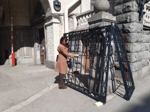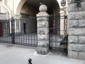 Была проведена реставрационная работа с декоративным металлом калиток. Эти работы выполнялись специалистами в условиях мастерской с поэтапным предъявлением работ представителям Заказчика (собственникам здания) и специалистам КГИОП. Металлодекор был разобран, полностью расчищен от слоев краски и коррозии. После расчисток стало возможным определить утраты. К счастью, утраты кованых элементов оказались незначительны – около 7% всего объема материала. Далее была выполнена грунтовка и окраска по специально разработанной технологии. При изготовлении новых ворот по разработанным чертежам, декоративные элементы были изготовлены методом ковки по сохранившемся аналогам, горизонтальные и вертикальные элементы наполнения были выполнены методом фрезеровки. После чего, металлические ворота были полностью скомплектованы, выполнена их грунтовка и окраска. После проведения реставрации воссозданные исторические элементы были смонтированы на установленные проектом места.