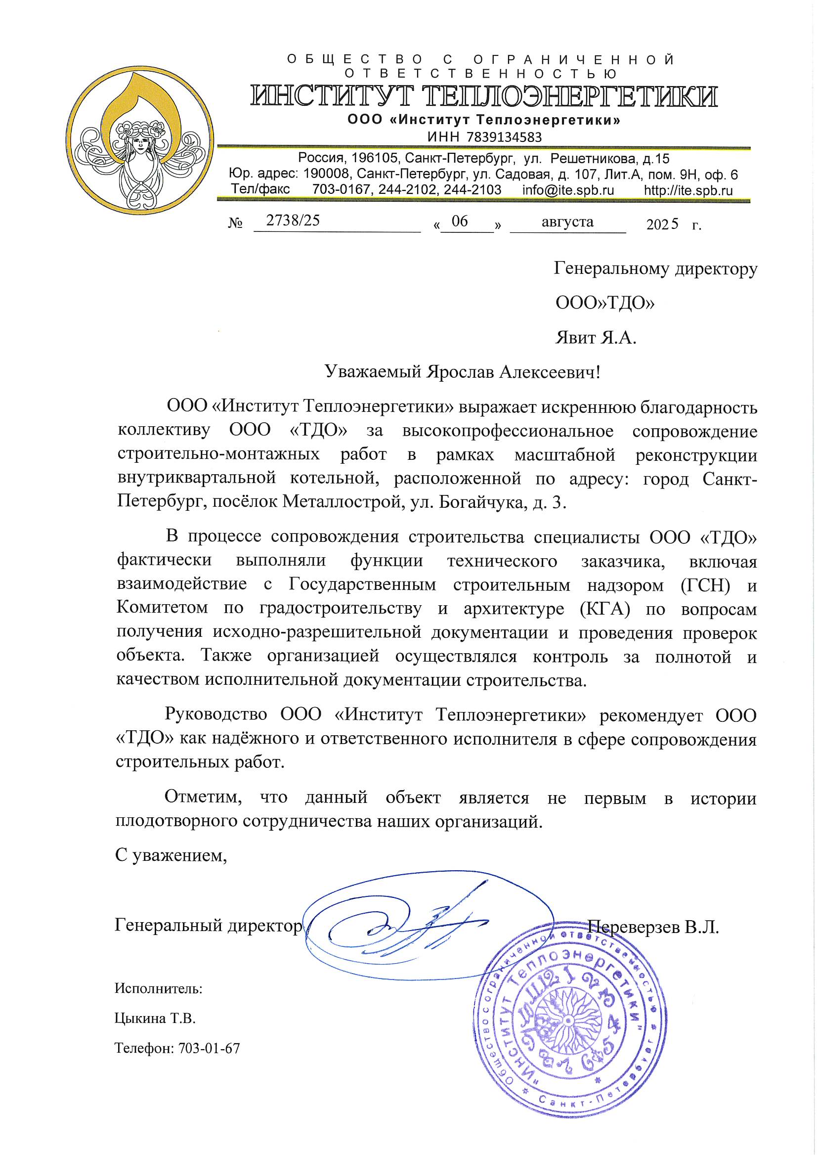 Специалисты службы технического заказчика ООО «ТДО» были отмечены благодарственным отзывом от ООО «Институт Теплоэнергетики» за успешное сопровождение проекта по реконструкции и техническому перевооружению котельной, расположенной на улице Богайчука в поселке Металлострой.