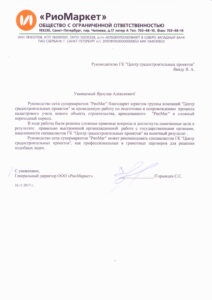 Руководство сети супермаркетов РиоМаркет выразило благодарность специалистам группы компаний «Центр градостроительных проектов» за оказание юридических услуг по сопровождению объектов сети супермаркетов.