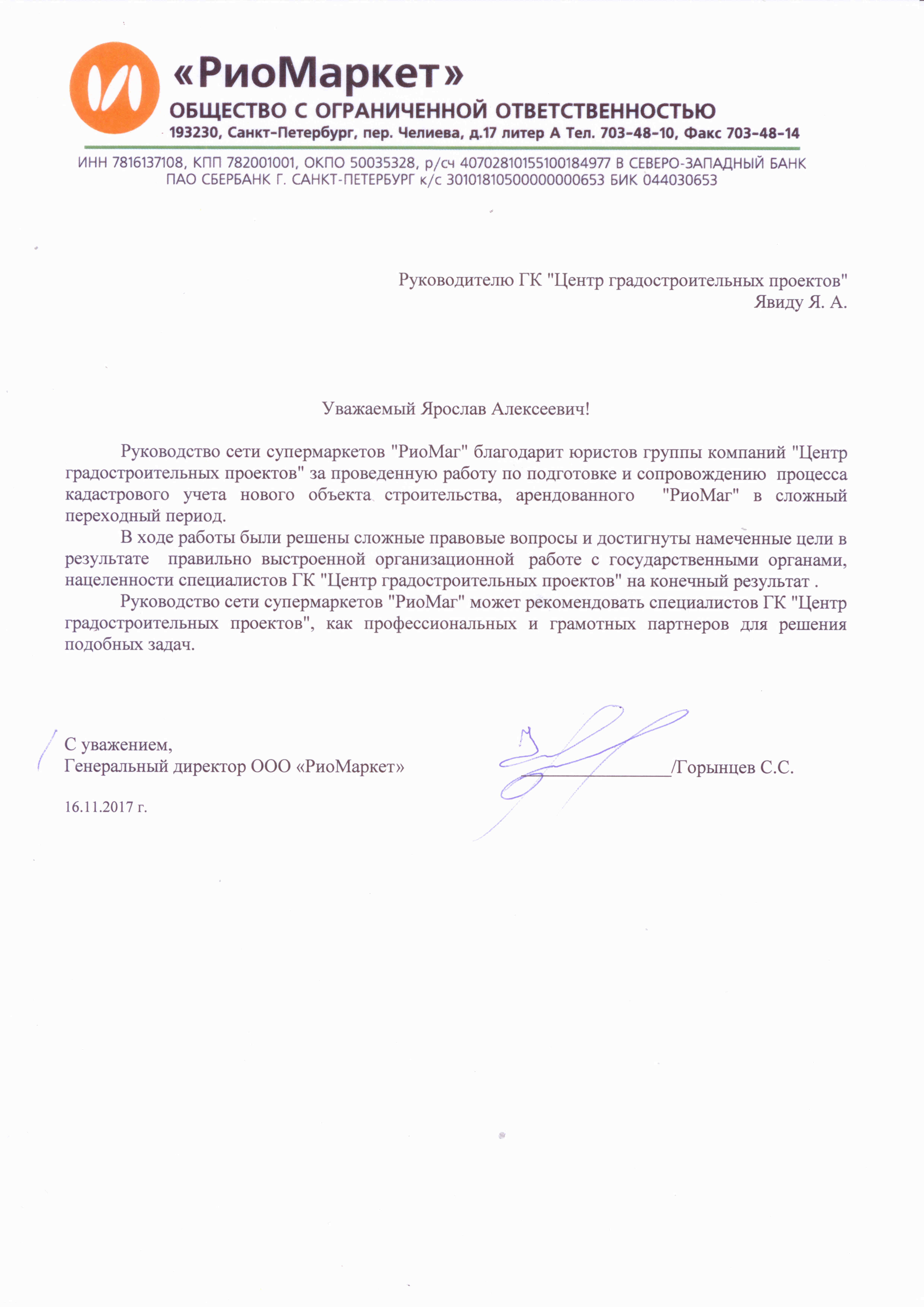 Руководство сети супермаркетов РиоМаркет выразило благодарность специалистам группы компаний «Центр градостроительных проектов» за оказание юридических услуг по сопровождению объектов сети супермаркетов.
